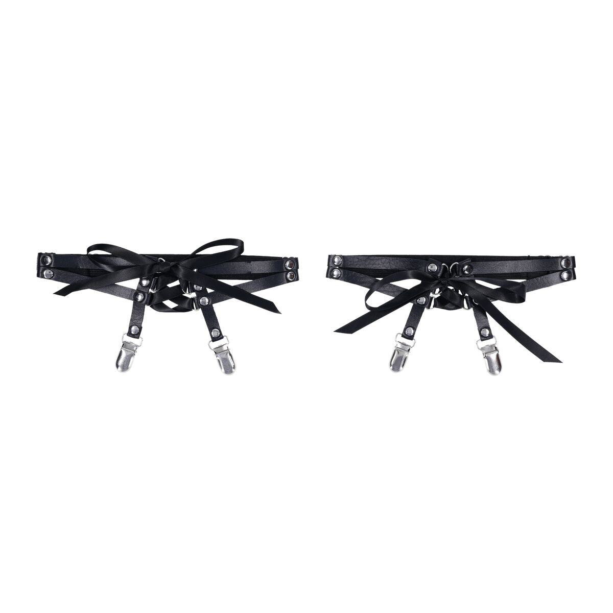 Add a touch of flirtatious elegance with these captivating garters, featuring a sultry lace-up corset design. Black satin ribbon weaves through the faux leather panels, creating an adjustable fit that hugs your thighs with seductive precision. A secure clip keeps thigh-high stockings perfectly in place, while the combination of bold structure and soft satin details strikes the perfect balance between edgy and romantic. Whether you're embracing your daring side or indulging in a moment of sensual confidence, these garters are designed to make a statement